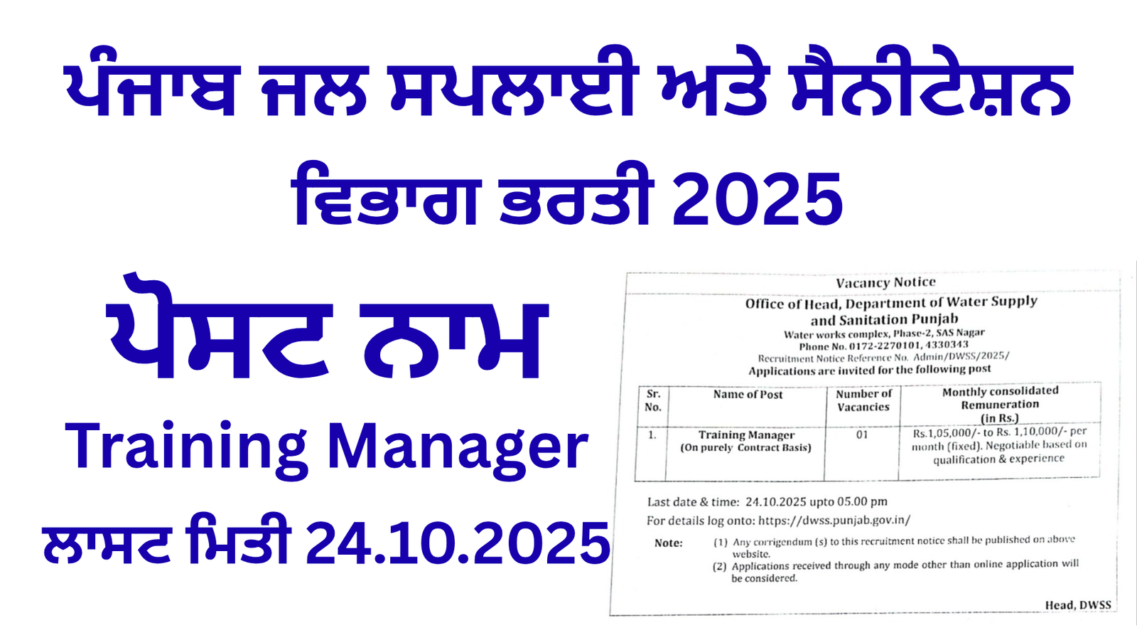 Punjab Water Supply and Sanitation Department Recruitment 2025 Applications are invited for the following post...