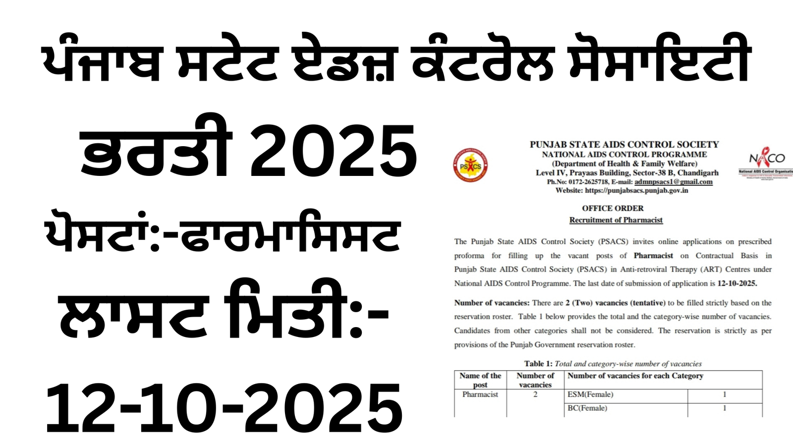 PSACS Pharmacist Recruitment 2025 The Punjab State AIDS Control Society (PSACS) invites online applications on...
