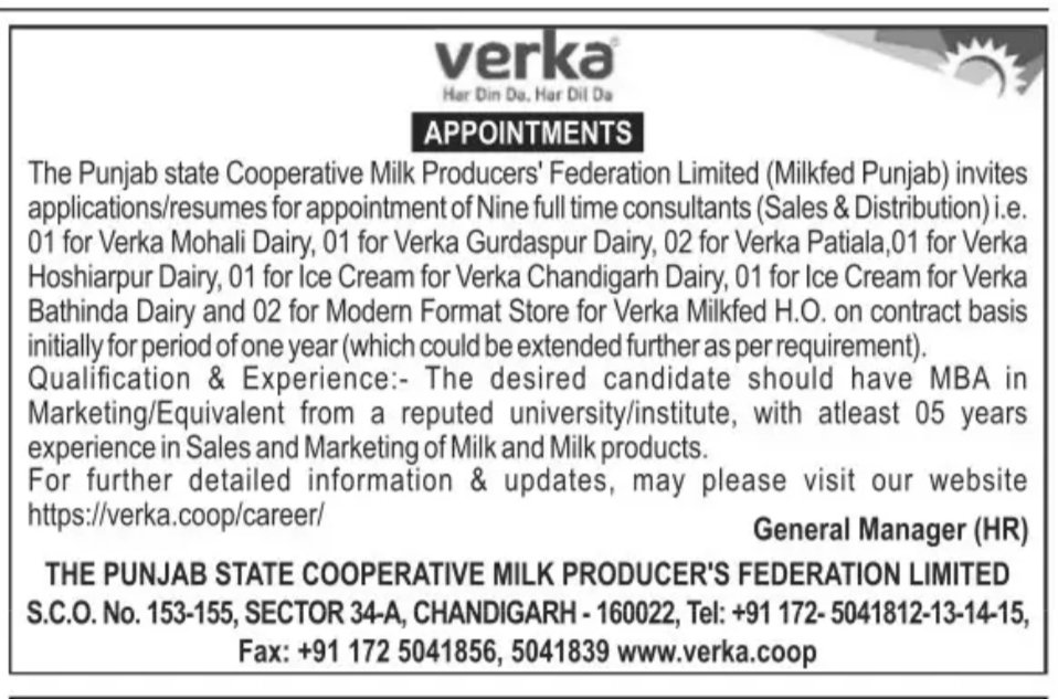 Punjab Verka Bharti 2025 The Punjab state Cooperative Milk Producers’ Federation Limited (Milked Punjab) invites...
